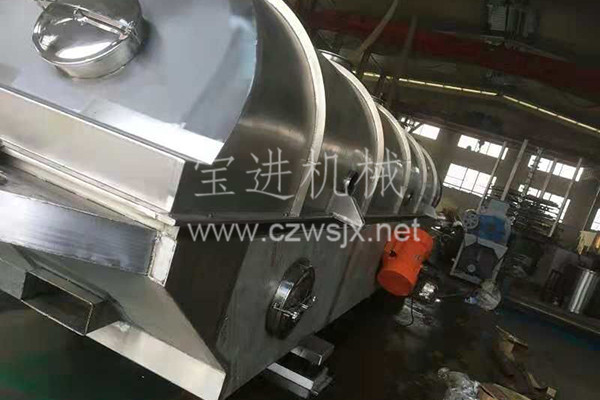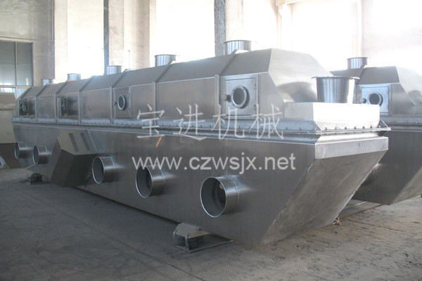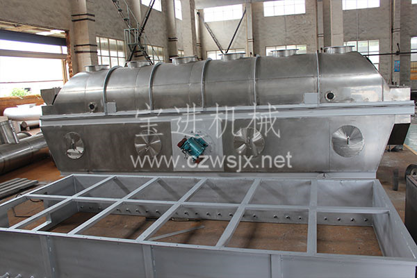 物料自進(jìn)料口進(jìn)入機(jī)內(nèi),在振動(dòng)力作用下,物料沿水平流化床拋擲,向前連續(xù)運(yùn)動(dòng),熱風(fēng)向上穿過流化床同濕物料換熱后,濕空氣經(jīng)旋風(fēng)分離器除塵后由排風(fēng)口排出,干燥物料由排料口排出。
