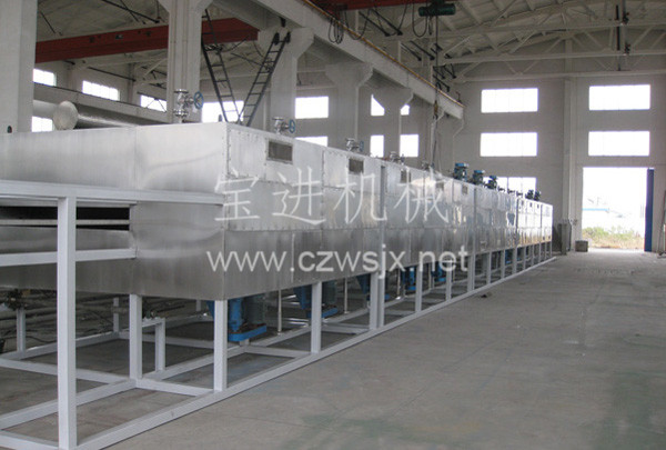 物料由加料器均勻地鋪在網(wǎng)帶上,網(wǎng)帶一般采用12-60目不銹鋼絲網(wǎng),由傳動(dòng)裝置拖動(dòng)在干燥機(jī)內(nèi)移動(dòng)。干燥機(jī)由若干單元組成,每一單元熱風(fēng)獨(dú)立循環(huán),部分尾氣由專門排濕風(fēng)機(jī)排出,廢氣由調(diào)節(jié)閥控制,熱氣由下往上或由上往下穿過鋪滿物料的網(wǎng)帶完成熱量與質(zhì)量傳遞的進(jìn)程,帶走物料水份。網(wǎng)帶緩慢移動(dòng),運(yùn)行速度可根據(jù)物料溫度自由調(diào)節(jié),干燥后的成品連續(xù)落入收料器中。上下循環(huán)單元根據(jù)用戶需要可靈活配備,單元數(shù)量亦可根據(jù)需要選取。